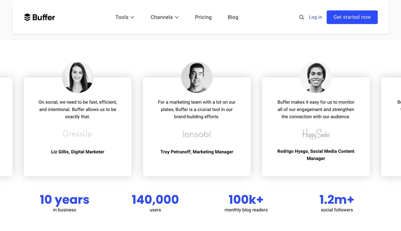 Buffer ünlü markalarda çalışan, pazarlama ile ilişkili kullanıcıların yorumları ve etkileyici metriklerle bir sosyal kanıt stratejisi sunuyor.